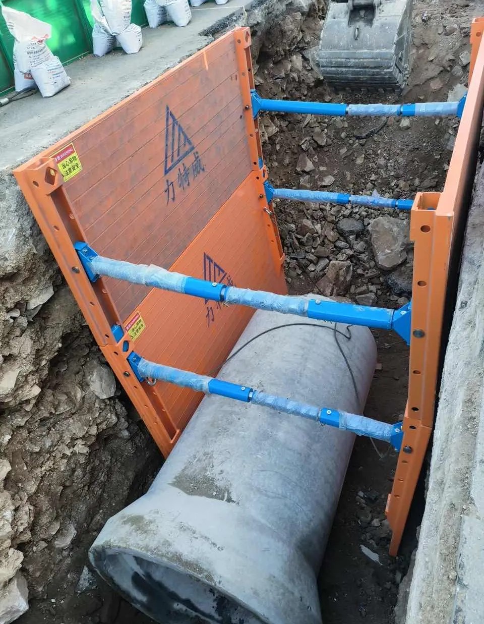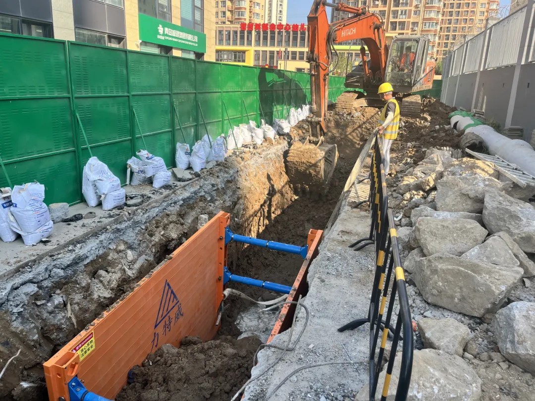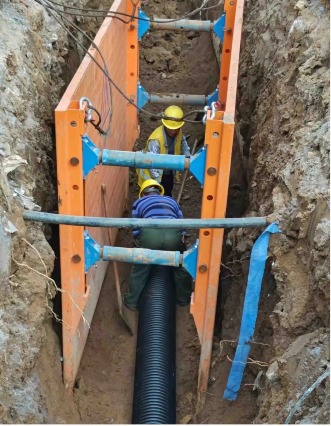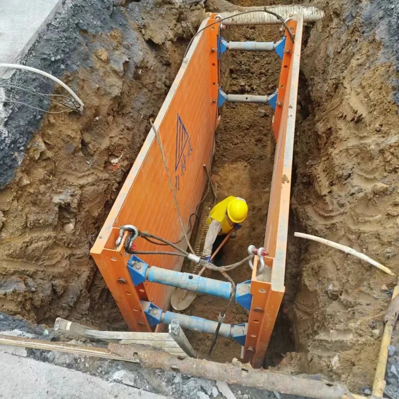 該箱式支護(hù)系統(tǒng)大大降低了管溝槽塌方的風(fēng)險,工人在支護(hù)系統(tǒng)內(nèi)施工安全更有保障。