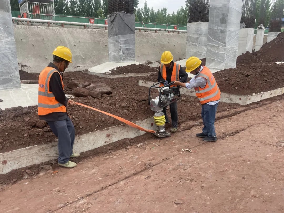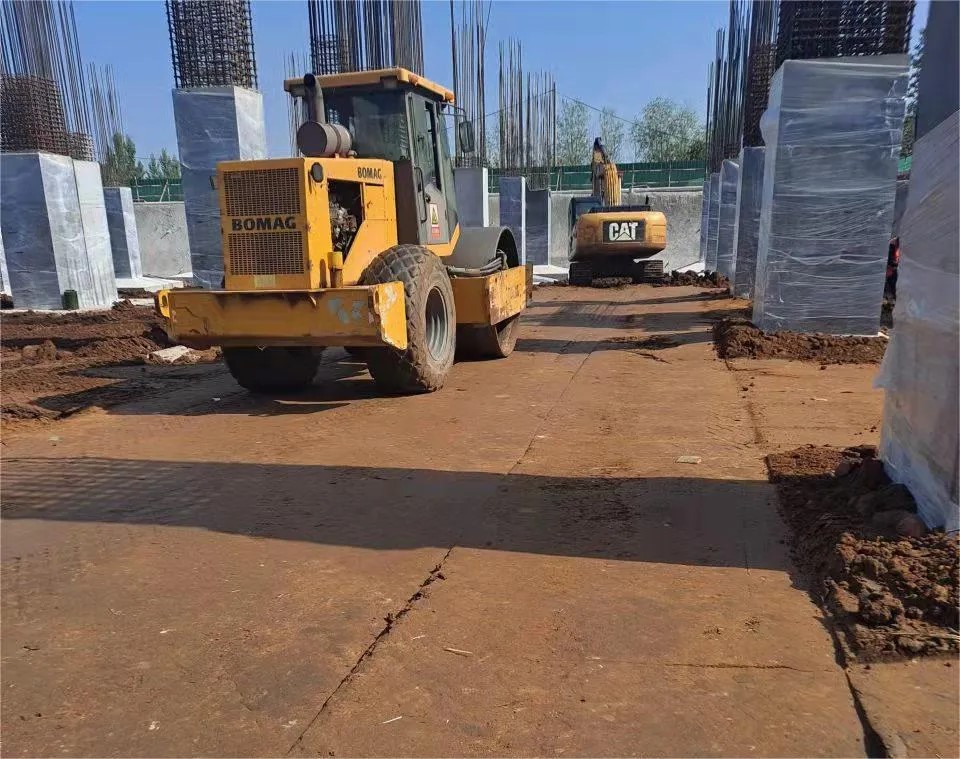 大面采用壓路機(jī)振動(dòng)碾壓密實(shí),碾壓次數(shù)3-4遍,柱邊、基坑邊、墻邊等機(jī)械無(wú)法碾壓到的部位,采用柴油打夯機(jī)進(jìn)行人工夯實(shí)。